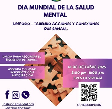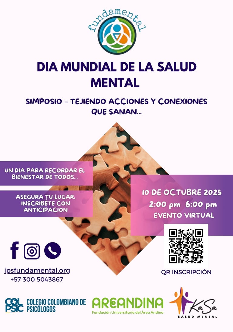 En el marco del Día Mundial de la Salud Mental, la IPS Fundamental, en alianza con Kasa Salud Mental, Fundación Universitaria del Área Andina y el Colegio Colombiano de Psicólogos, abre un espacio de reflexión y aprendizaje para todos quienes creemos en el poder de cuidar la mente y el corazón.